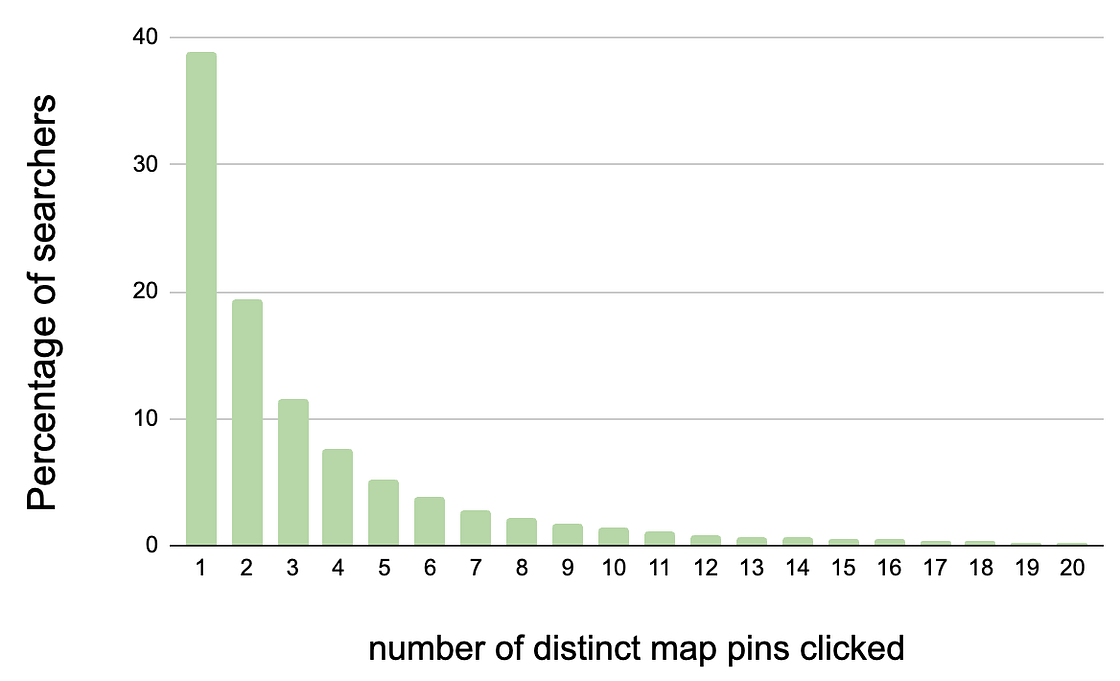 To adapt ranking to the map interface, we look at new ways of modeling user attention flow across a map. We start with the most straightforward assumption that user attention is spread equally across the map pins. User attention is a very precious commodity and most searchers only click through a few map pins (see Figure 3). A large number of pins on the map means those limited clicks may miss discovering the best options available. Conversely, limiting the number of pins to the topmost choices increases the probability of the searcher finding something suitable, but runs the risk of removing their preferred choice.