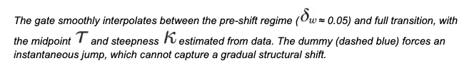 The logistic gate is the key. Instead of a binary before/after indicator, it learns a smooth S-shaped curve that ramps from 0 to 1 over a window of time. This means the model can represent both sudden shocks (steep curve) and gradual structural transitions (gentle slope), and crucially, it can project the transition forward into periods it has not yet observed (Figure 5).