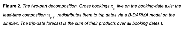 - Lead-time composition. Of the bookings recorded today, what fraction correspond to trips happening in each future time window? This is a compositional time series, a vector of proportions which must sum to one. The final trip-date forecast is the product of the two: gross bookings, multiplied by the lead-time composition vector, so the booking-date axis generates the trip-date axis.