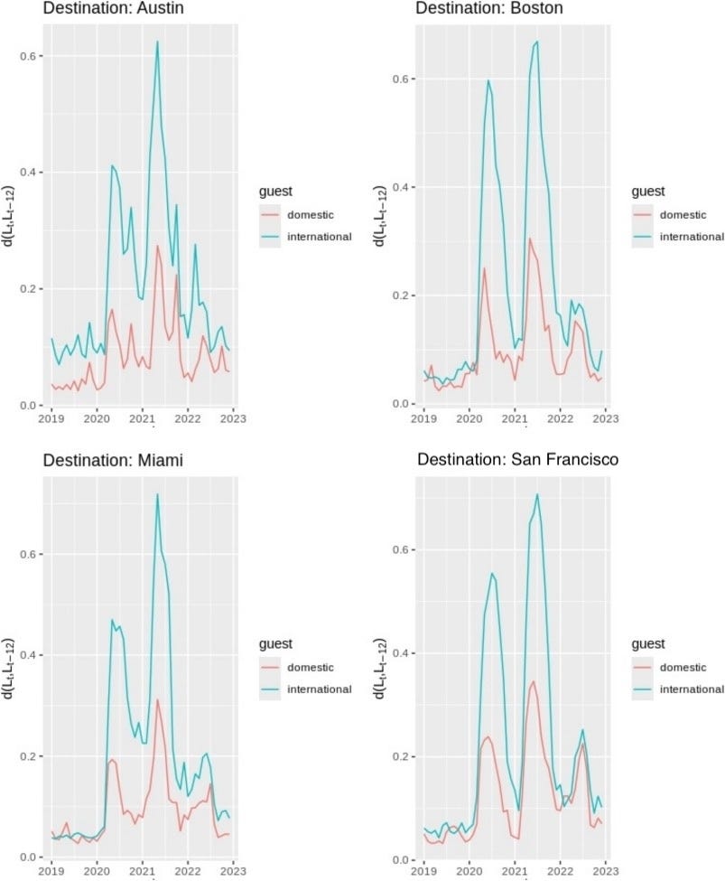 To quantify this, we started measuring the full distributional divergence between the current lead-time composition and a pre-pandemic baseline using a normalized L1 (Manhattan) distance. Instead of reducing the distribution to a mean or median, this captures the entire shape change: which parts of the distribution shifted, by how much, and whether they recovered. When we applied this approach to booking data across four major U.S. cities from 2018 to 2022, we found a clear two-phase pattern: an abrupt disruption at the pandemic’s onset, followed by a partial recovery that plateaued well short of pre-pandemic norms. The distribution did not return to its old shape; it settled into a new one (Figure 4). The divergence was especially pronounced for international guests, whose booking horizons compressed more sharply and recovered more slowly than domestic travelers. This is consistent with the layered effect of travel restrictions, visa uncertainty, and longer planning cycles that characterize cross-border travel. Even by late 2022, international lead-time distributions remained further from their pre-pandemic baseline than domestic ones.