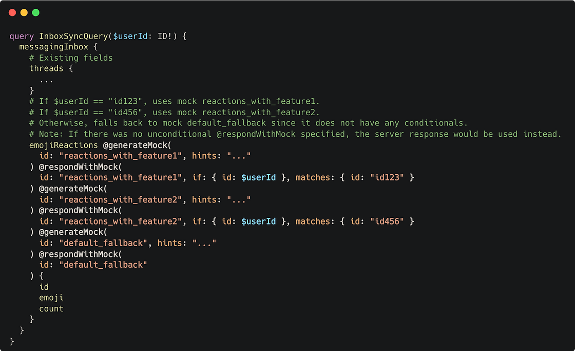 @respondWithMock can also be specified on individual fields. When used on fields within a query instead of on the query itself, the GraphQL client will actually request all fields from the server except those annotated with @respondWithMock, then patch in locally mocked data for the remaining fields — producing a hybrid of production and mock data, and making it possible for client engineers to develop against new (unimplemented) fields in existing queries. Engineers can even repeat this directive and use query input variables to decide if and when to return a specific generated mock at runtime, as shown below: