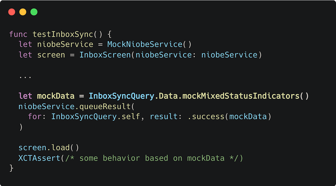 During code generation, Niobe produces both a JSON file containing the actual mock data for each @generateMock directive, as well as a source file that provides functions for loading and consuming mock data from demo apps, snapshot tests, and unit tests. As shown in the Swift code below, the mockMixedStatusIndicators() function is generated on the InboxSyncQuery’s root Data type. It provides access to an instantiated type that’s populated with the generated mock data for mixed_status_indicators, allowing engineers to use the mock without having to load the JSON data manually: