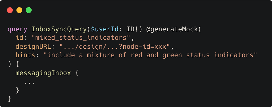 To generate mock data while keeping engineers in their local focus loops, we introduced a new client GraphQL directive called @generateMock, which engineers can use to automatically generate mock data for a given GraphQL operation, fragment, or field: